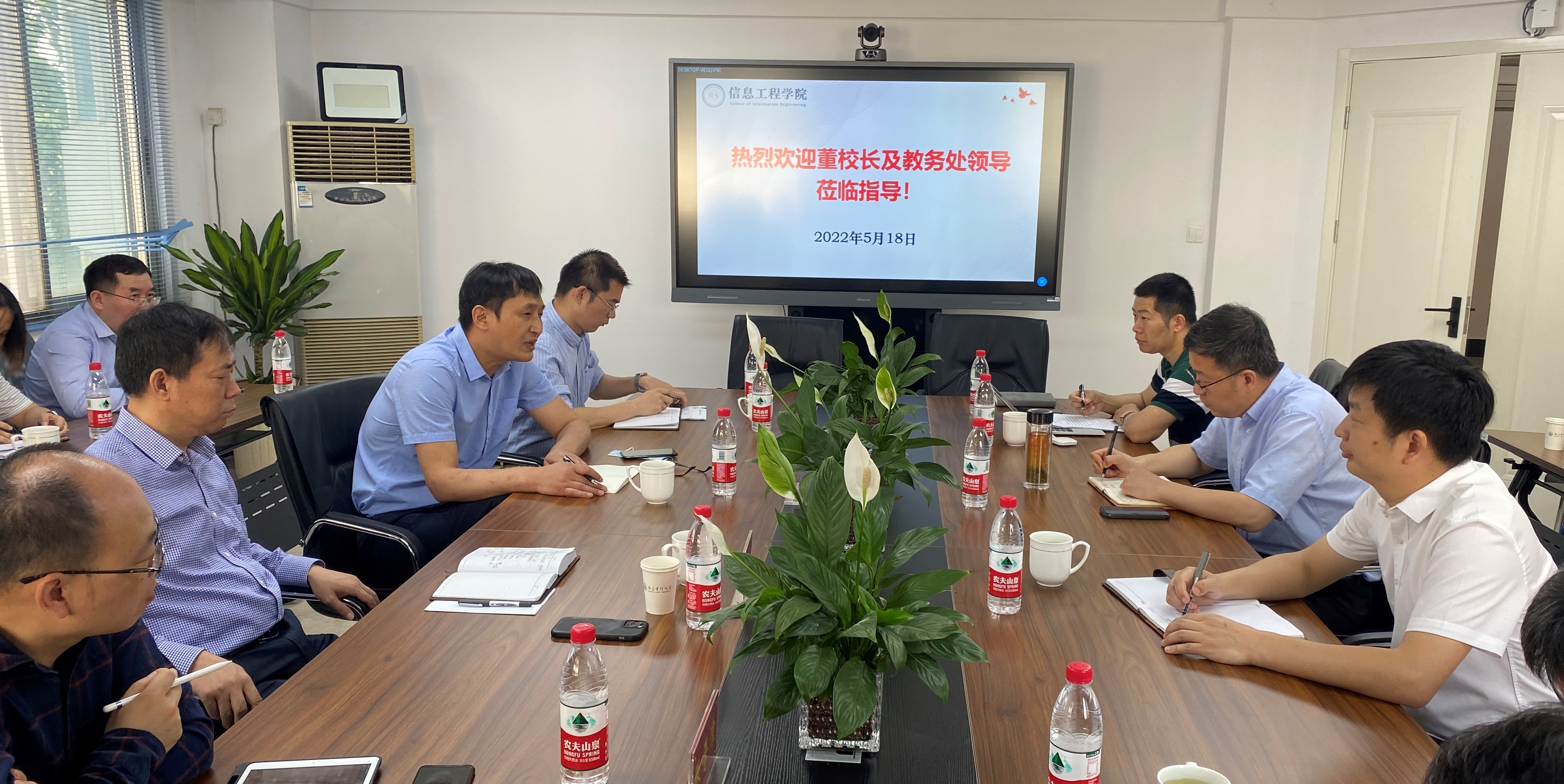 2022年5月18日上午,董必荣副董事长带领教务处苍玉权处长等领导莅临信息工程学院,就疫情防控、本科课程教学、春学期期末考试等工作进行指导。信息工程学院领导班子、各系部主任参加会议。
